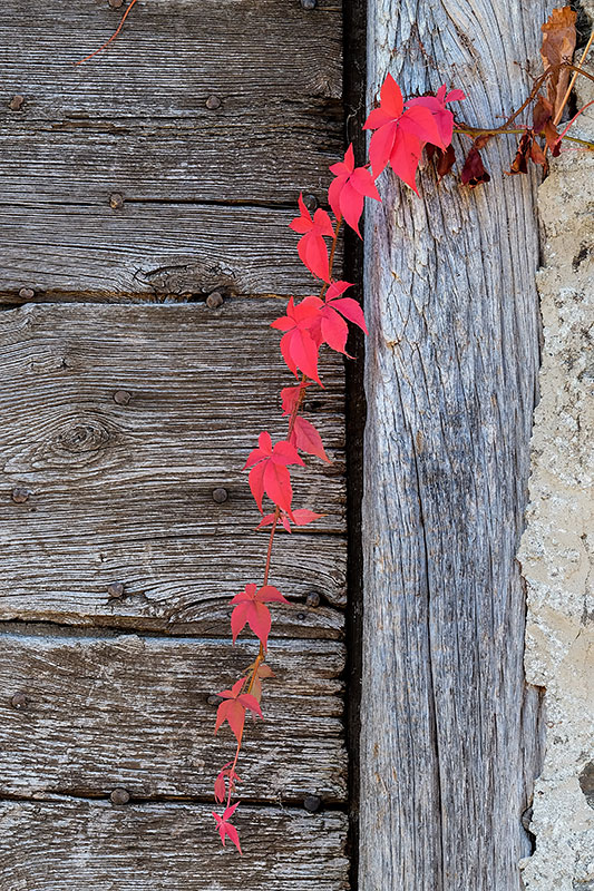Feuilles rouges devant une porte en bois (Valon - au nord de l'Aveyron, oct. 2025)