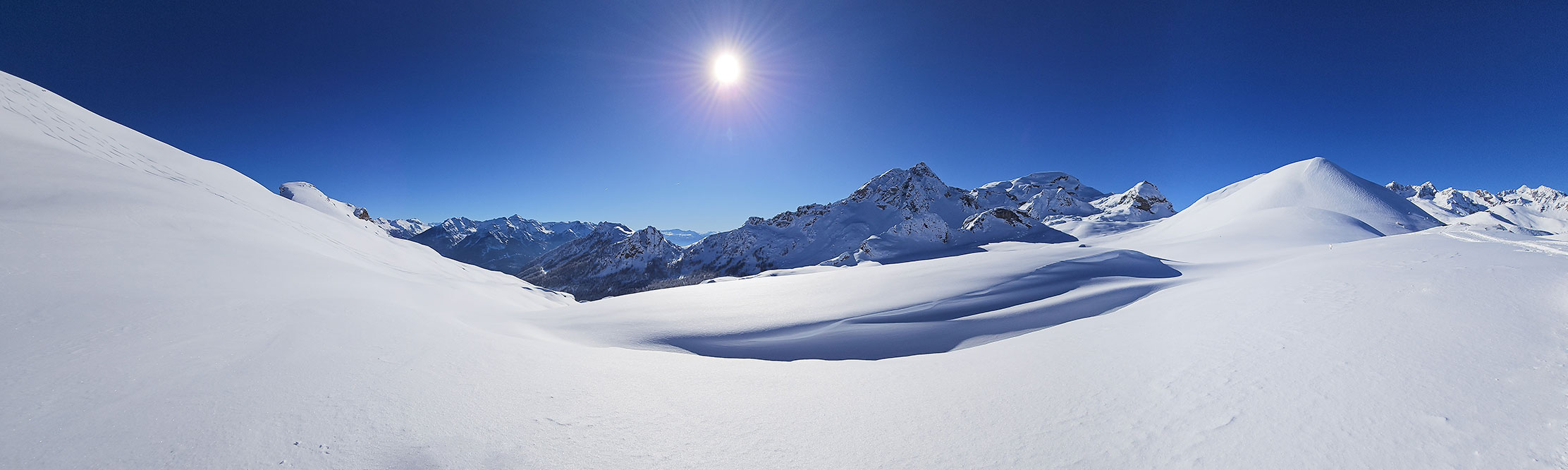 France, Hautes-Alpes (05) : Réserve Naturelle Régionale des Partias vue du Col de Chevalier (2400 m, accessible en seulement 1/2h de peaux de phoque depuis les pistes de Serre Chevalier ; janvier 2024) Photo prise avec mon smartphone (Samsung Galaxy S23) en mode Panorama automatique, à peine retouchée !