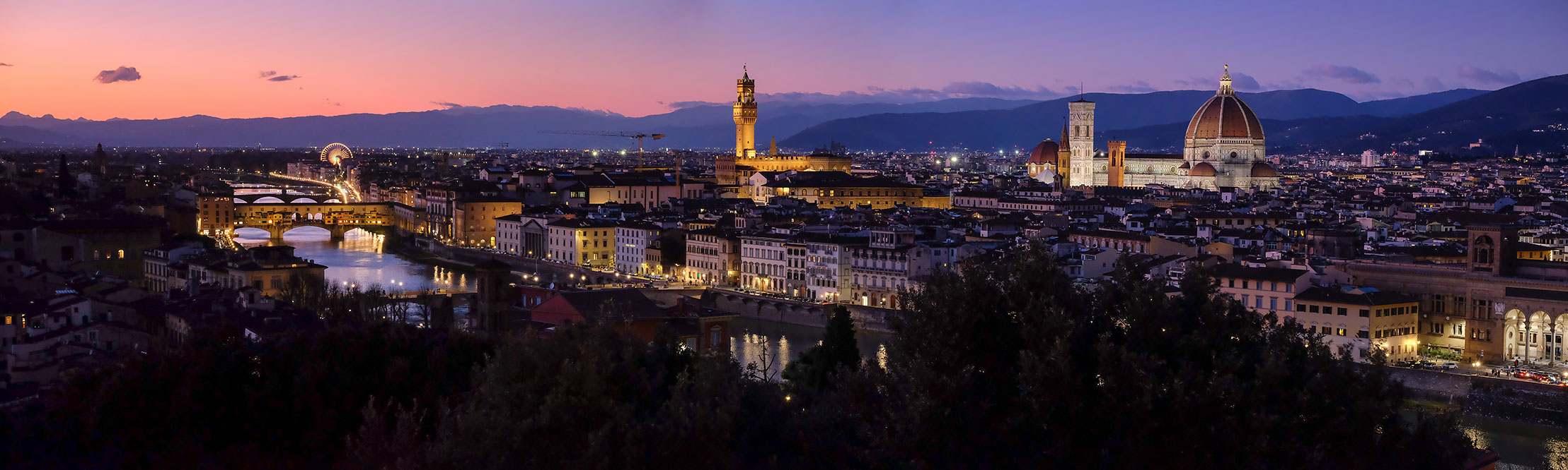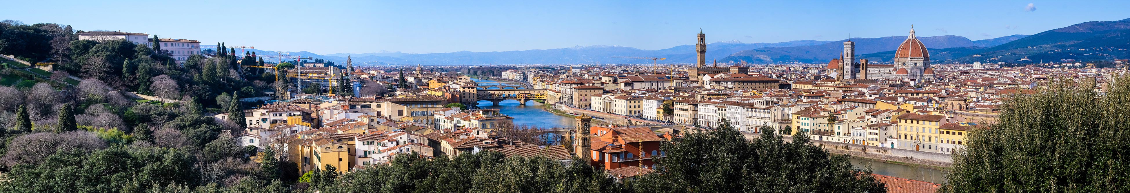 Italie, Florence : vue sur (notamment) le Ponte Vecchio, le Palasso Vecchio, le Campanile di Giotto et la Cattedrale Santa Maria del Fiore (ou Duomo di Firenze), depuis la Piazzale Michelangelo (jan. 2025) Collage de 4 photos à main levée