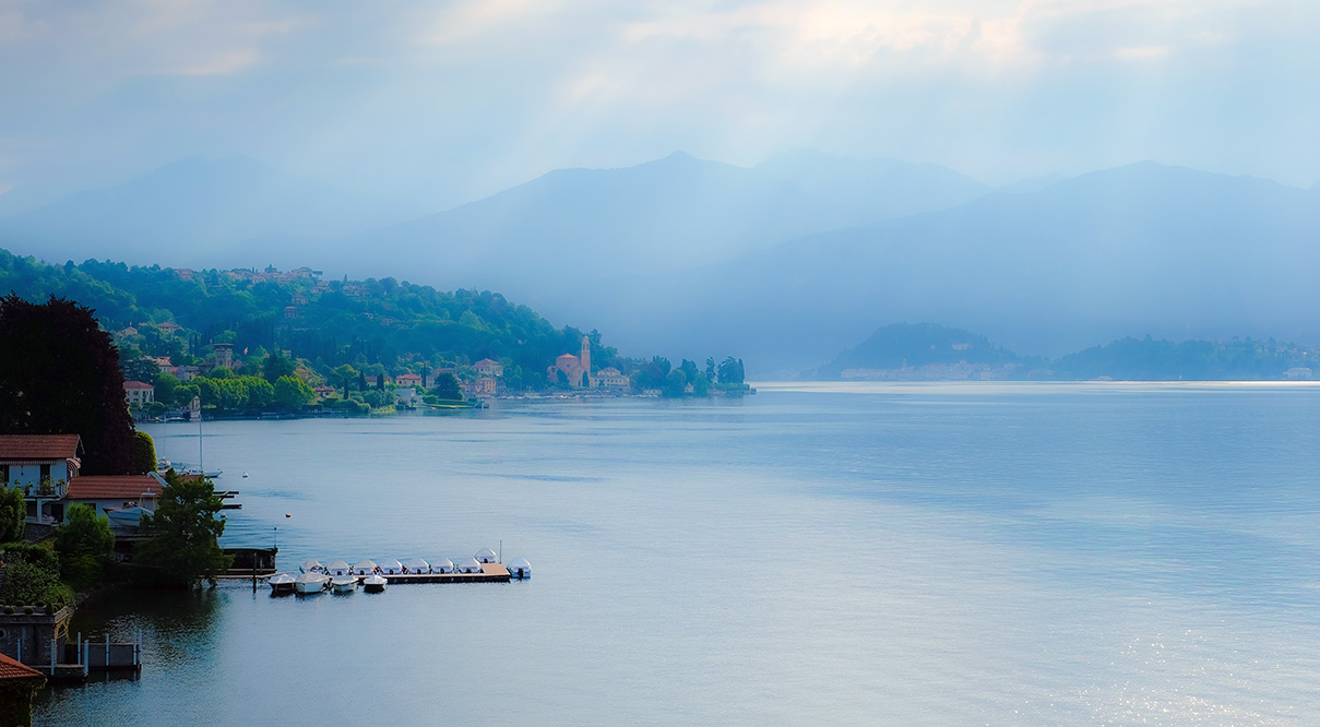 Italie : aube naissante sur le lac de Côme (la brume evanescente sied à merveille à la quiétude des lieux !) Vue sur Tremezzo (au centre) et Bellagio (en arrière-plan) depuis Lenno (mai 2023)