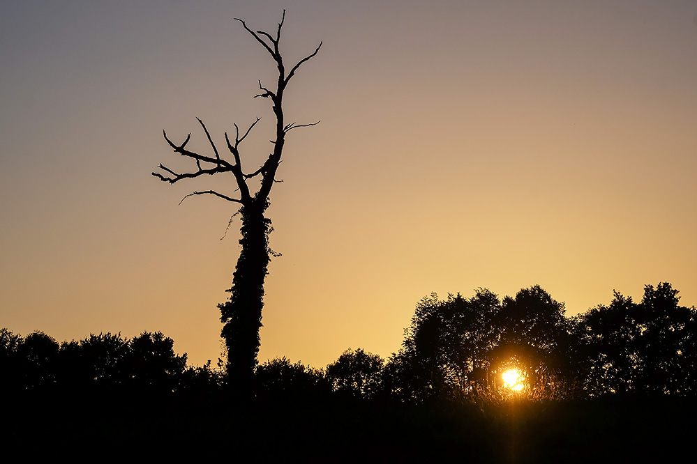 Coucher de soleil sur un arbre mort, à Lacroix-Barrez (nord de l'Aveyron ; octobre 2025)