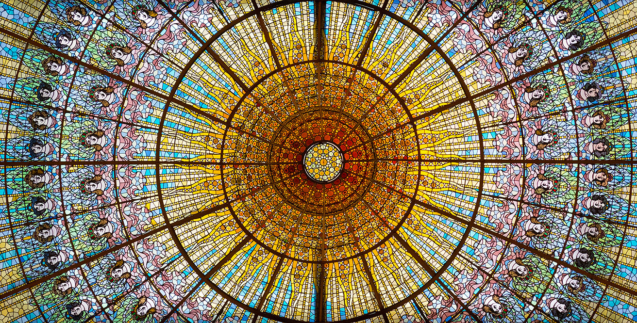 Espagne, Barcelone : détail du plafond du Palau de la Música (nov. 2013)
