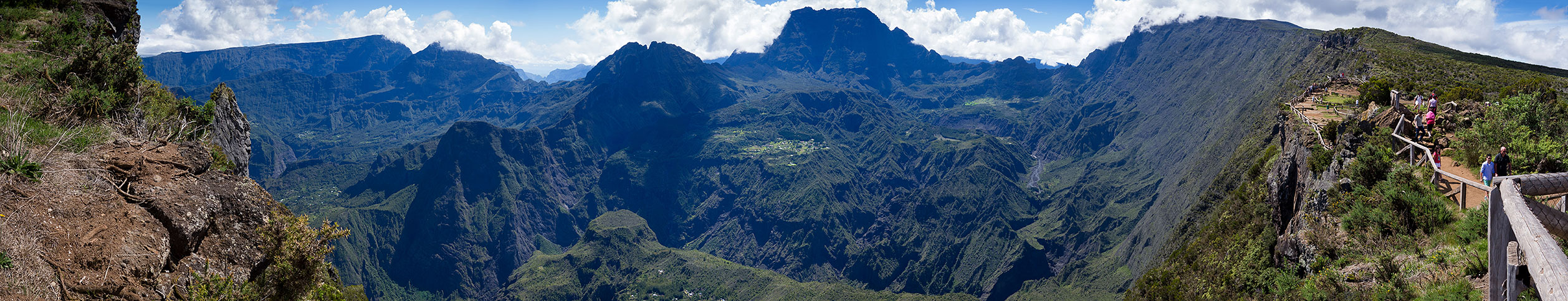 Ile de la Réunion, cirque de Mafate vu du Maïdo (2200 m) : pour moi l'un des plus beaux panoramas au monde. Village au milieu : La Nouvelle (1400 m) ; mont en arrière-plan : Gros Morne (3019 m) (décembre 2013) Collage de 7 photos (prises à main levée)