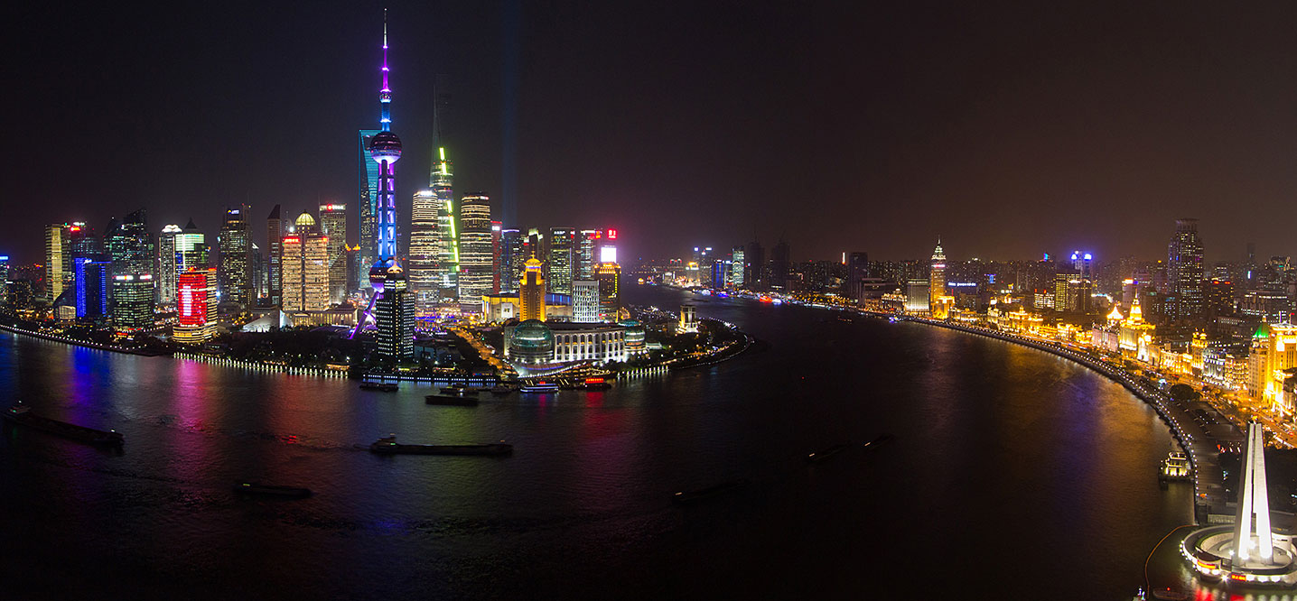 Chine, Shanghai : Pǔdōng et sa tour TV Perle d'Orient (468 m), rivière Huangpu et le Bund vus du bar... VUE (33e étage de l'hôtel Hyatt) (décembre 2014) Collage de 3 photos