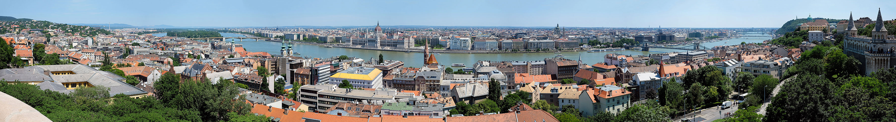 Hongrie : Budapest et le Danube vus du nord de la colline du château (Várhegy) (juin 2015) Collage sous Photoshop de 7 photos prises à main levée => panorama de 82 Mp, réduit au 1/50e