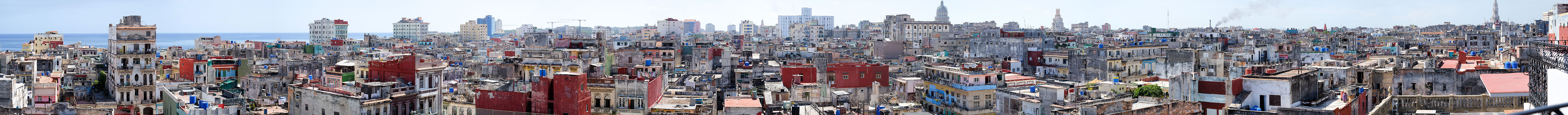 Cuba : panorama de 180° de la Havane, ville incroyable, aussi vivante qu'elle est décatie, vue du toit de l'immeuble où a été tourné Fresa y chocolate en 1993 (film de Tomás Gutiérrez Alea et Juan Carlos Tabío), et qui abrite aujourd'hui l'excellent restaurant La Guarida (rue Concordia ; voir aussi l'intérieur de l'immeuble ; juillet 2017) Collage sous Photoshop de 12 photos prises à main levée => panorama de 138 Mp (43 352 x 3 190 pixels), réduit ici à 3,2 Mp seulement (6 576 x 484 pixels)