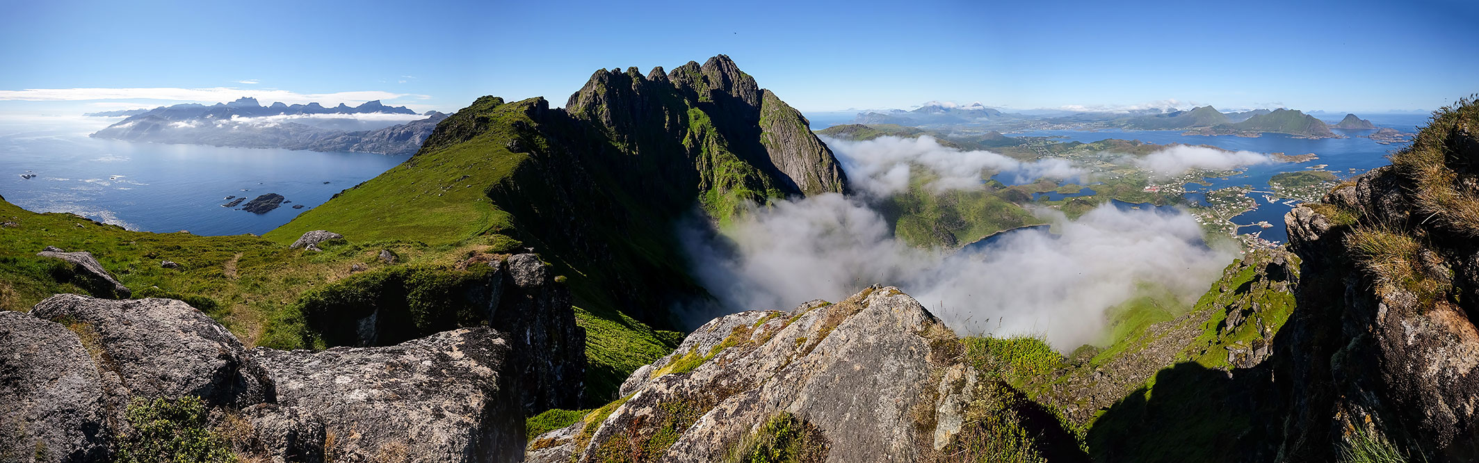 Norvège, îles Lofoten, Ballstadheia ; en ajoutant l'élément eau, les îles Lofoten dépassent peut-être le cirque de Mafate dans la liste des plus beaux panoramas mondiaux ! (juillet 2018) (deux autres paysages de Ballstad ici)