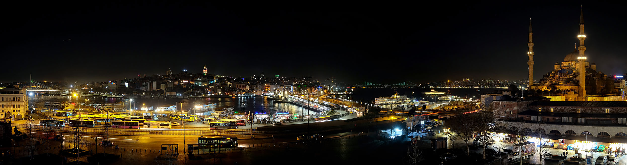 De gauche à droite : pont de Haliç (métro, 2013) ; Tour de Galata ; pont de Galata ; « 1er pont » (illuminé en vert, « pont des Martyrs du 15 juillet » depuis 2016), qui enjambe le Bosphore pour relier les rives européenne et asiatique de la ville ; mosquée Rüstem Pacha (mars 2019)