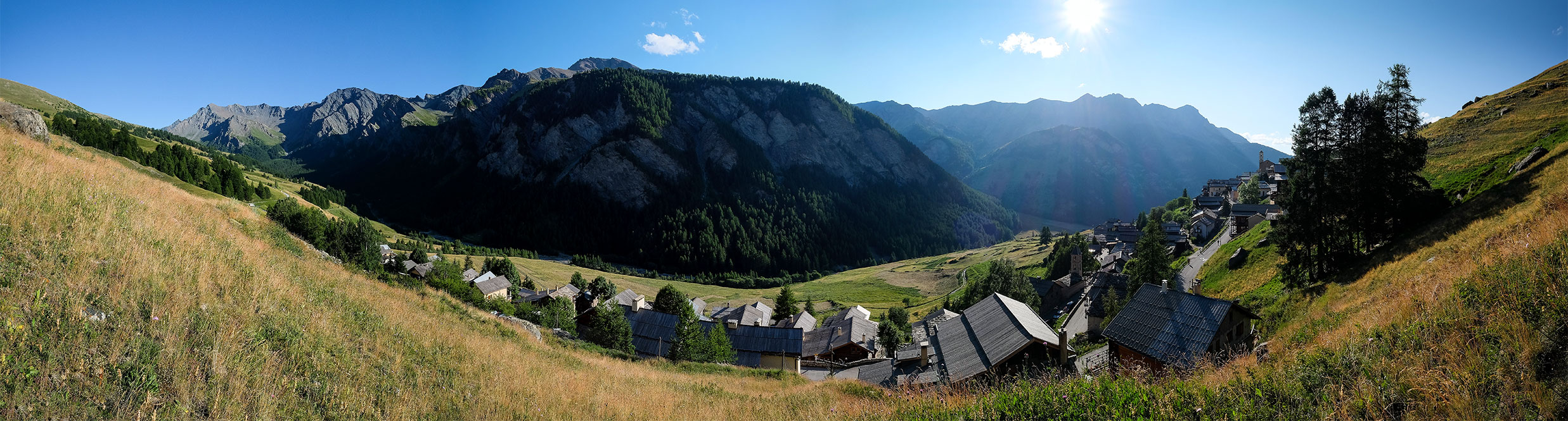 France, Hautes-Alpes (05), Queyras : Saint-Véran, ses 2042 m d'altitude (qui en feraient la commune la + haute d'Europe), ses « fustes » (parties supérieures des maisons traditionnelles) faits de troncs d'arbres empilés croisés aux angles, et ses toits de lauzes et bardeaux de mélèze (juillet 2021) • Collage de 4 photos à main levée • Vue de la rue principale ici