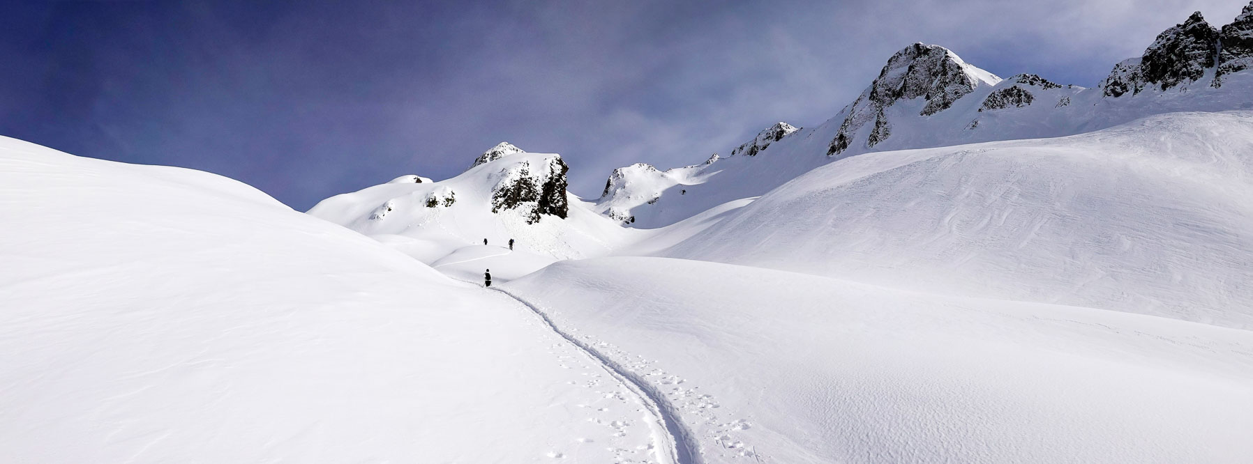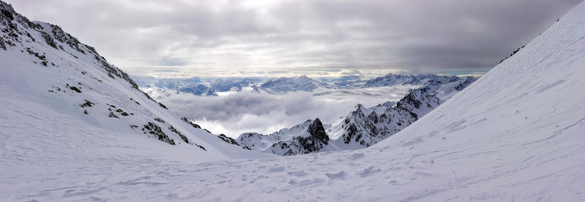 France, Hautes-Alpes (05) : Réserve Naturelle Régionale des Partias vue du Col de Chevalier (2400 m, accessible en seulement 1/2h de peaux de phoque depuis les pistes de Serre Chevalier ; janvier 2024) Photo prise avec mon smartphone (Samsung Galaxy S23) en mode Panorama automatique, à peine retouchée !