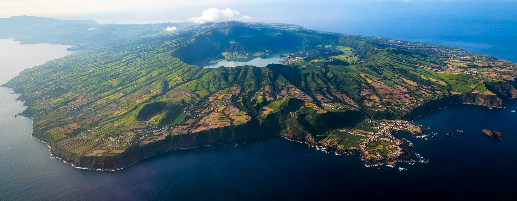 Portugal, Açores : arrivée sur l'île de São Miguel, avec vue aérienne sur les deux lacs (bleu et vert) de la caldeira de Sete Cidades (juin 2023)