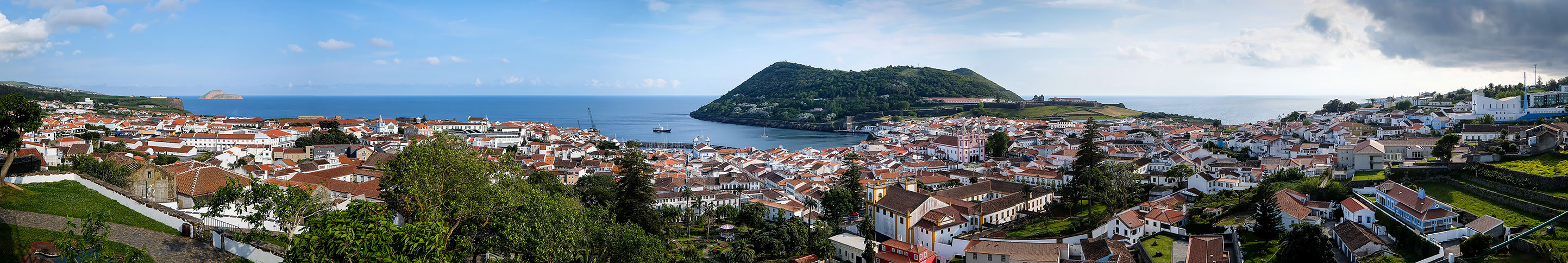 Portugal, Açores, Terceira : Angra do Heroísmo, ville colorée aux rues pavées parfois abruptes (ça n'est pas Éveline qui me contredira 😄), certainement la plus belle de l'archipel (vue du Alto da Memória, ou Memória a D. Pedro IV, ou encore « Outeiro da Memória » ; juin 2023) Collage sous Photoshop de 5 photos prises à main levée