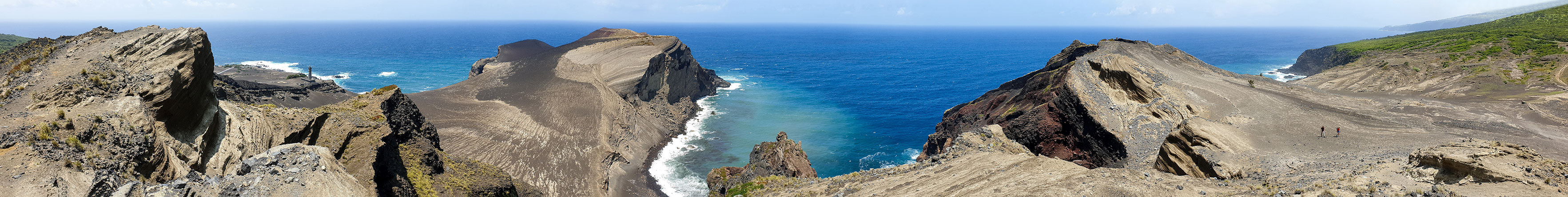 Portugal, Açores, Faial : vulcão dos Capelinhos, dont la première (et dernière) éruption, du 27 septembre 1957 au 24 octobre 1958 (son jeune âge explique l'absence de végétation), agrandit l'île de 2,4 km2 ; le phare (à gauche sur la photo), unique édifice ayant survécu, malgré sa proximité avec le volcan, est désormais séparé de l'océan par ce dernier (juin 2023)