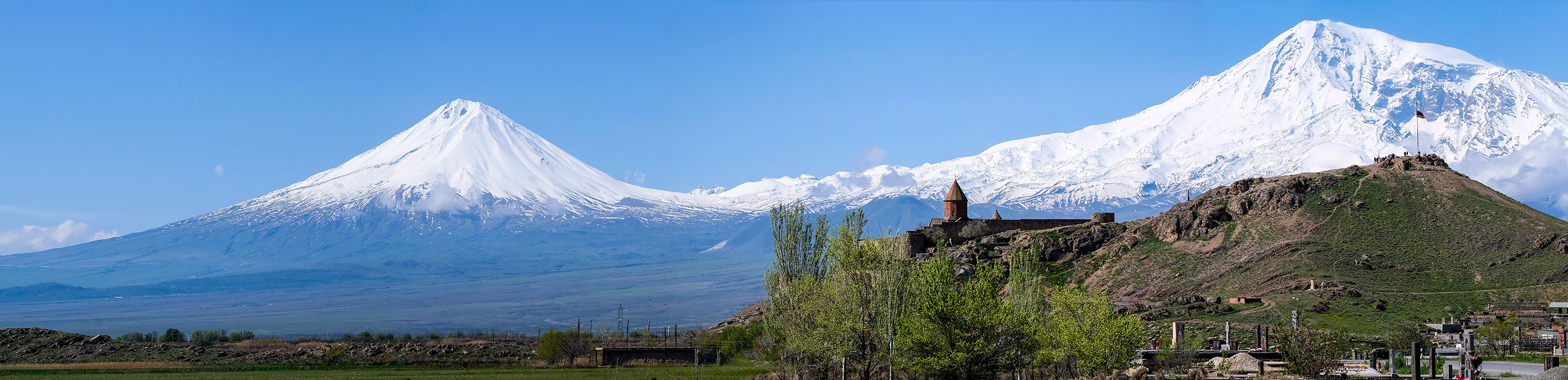 Arménie : monastère de Khor Virap (Խոր Վիրապ), premier lieu saint de l'Arménie chrétienne (VIIe s.), devant le Grand Ararat (également appelé Agri Dagi, 5137 m, à droite) et le Petit Ararat (3896 m, à gauche). Emblème de l'Arménie, le mont Ararat se situe en Turquie depuis 1923 et le traité de Lausanne... (avril 2024) Collage sous Photoshop de 5 photos (prises à main levée)