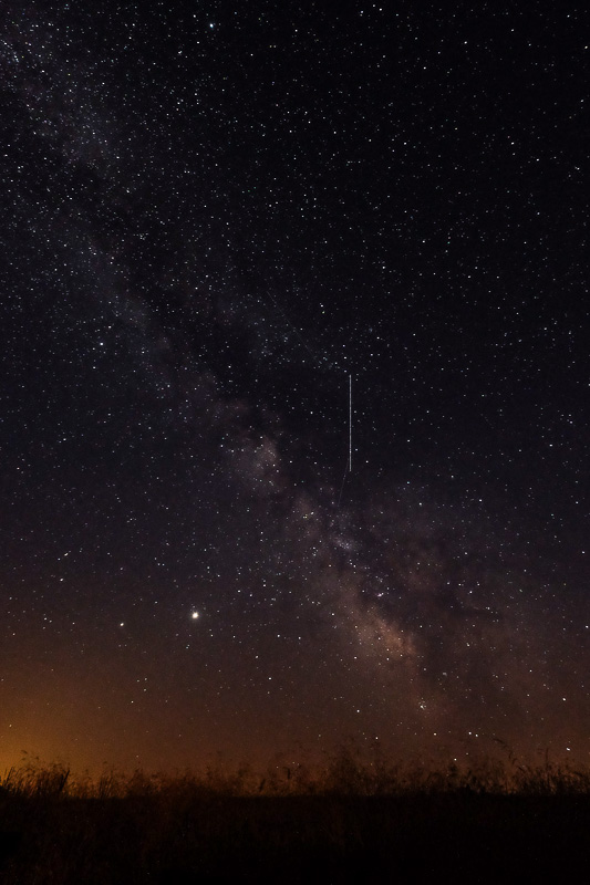 France : nuit étoilée sur le Lac du Pêcher (Cantal) : Voie Lactée, Jupiter, « étoile filante » (juillet 2020)