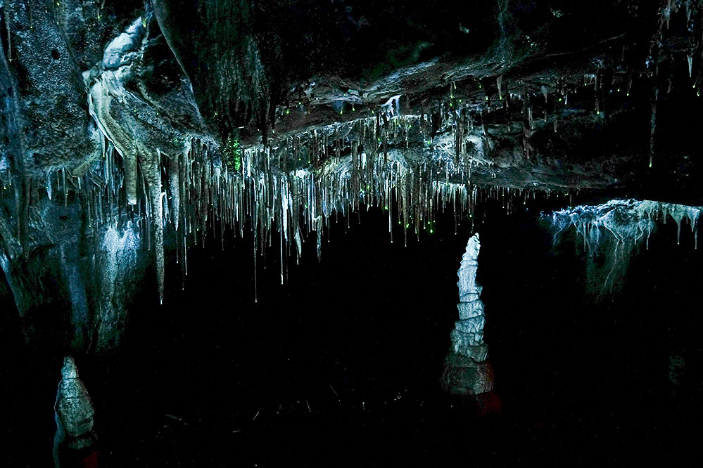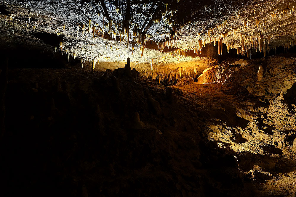 Grottes de Lacave (2/2) sous éclairage infrarouge, faisant ressortir les gouttelettes pendant des stalactites comme autant de lucioles (oct. 2025)