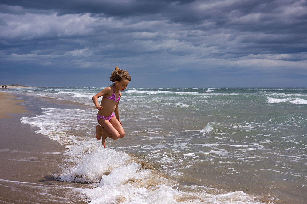 Albane, mon adorable espiègle filleule (7 ans), brave la froideur hostile des vagues d'Espiguette (France, Gard, Grau-du-Roi, mai 2014)