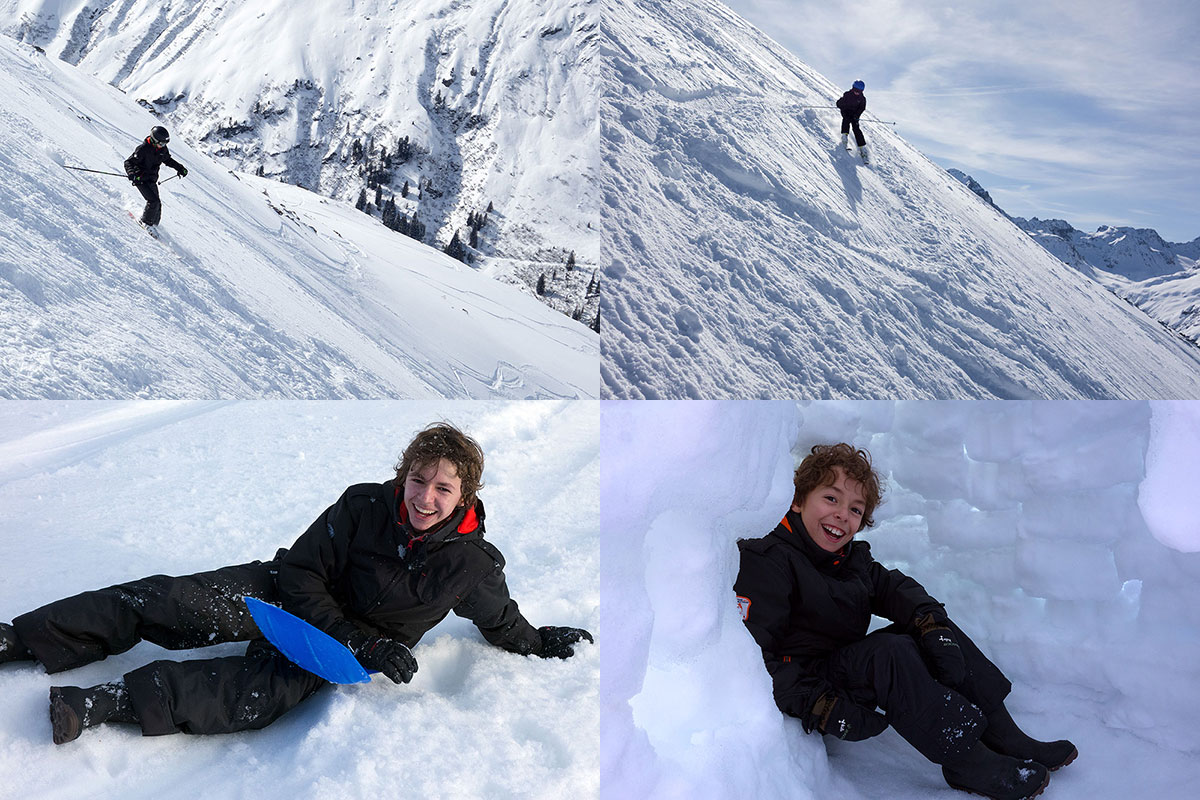 Ski : Thib & Mars dans les pentes poudreuses de St Anton am Arlberg ; après le ski : Thib s'éclate en luge, Mars dans l'igloo que j'ai construit :o) (Autriche, Tyrol, fév. 2016)