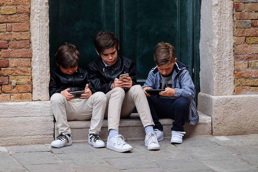 Italie, Venise, Campo de la Pescaria : trois jeunes vénitiens - ici comme ailleurs, c'est sur leurs smartphones que les plus jeunes passent leur temps