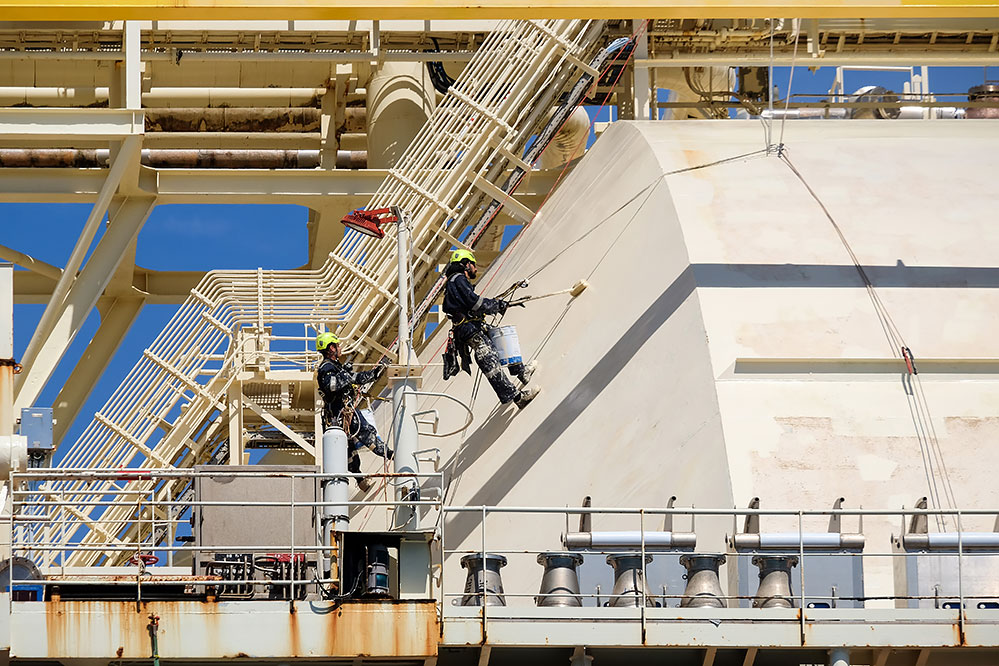 Malte, dans la baie de Marsaxlokk : deux peintres cordistes repeignent les cuves d'un navire gazier (mai 2025)