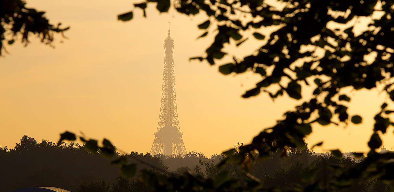 France : lumières du soleil couchant sur la Tour Eiffel (vue depuis Saint-Cloud ; septembre 2012)