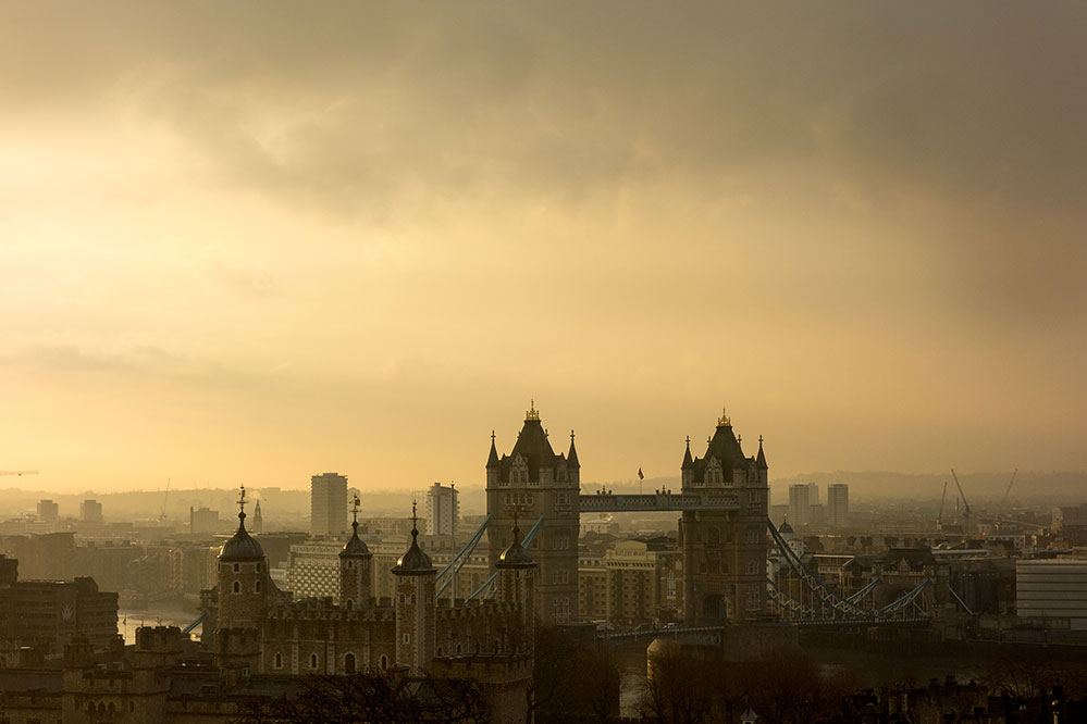 Angleterre, Londres : crépuscule sur la Tower of London et le Tower Bridge (depuis l'hôtel Hilton DoubleTree ; janvier 2014)
