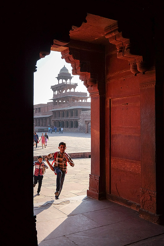 Inde, Fatehpur Sikri : enfants entrant en courant dans la salle d'audience Diwan-e-Khas (nov. 2016)