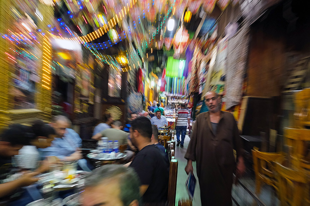 Égypte, Le Caire : dans le souk Khân al-Khalili (juin 2018) zoom pendant le déclenchement pour obtenir l'effet filé