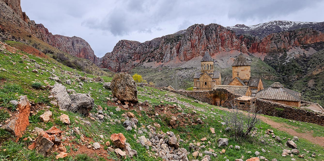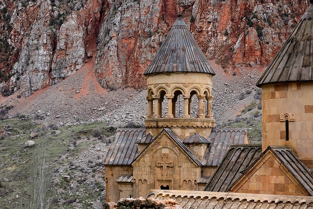 Arménie : une tout autre architecture s'offre à nous, à 120 km au S-E de la capitale : Noravank, niché au fond de l'étroite gorge Amaghou, à l'est du haut-plateau arménien (Petit Caucase). 1/2 (avril 2024)
