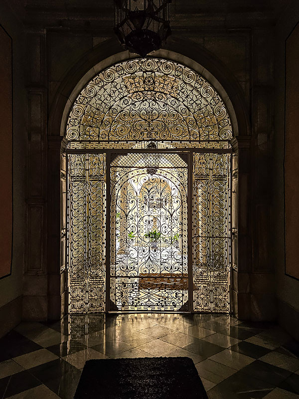 Espagne, Séville : grille d'entrée, laissant deviner l'un des innombrables et merveilleux patios andaloux de la ville (nov. 2025)