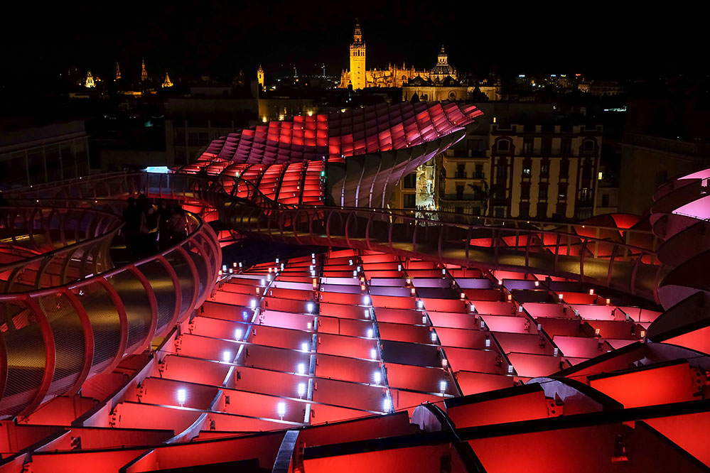 ... et qui offre un superbe panorama sur la ville, notamment de nuit — au fond : Giralda, Cathédrale, Iglesia del Salvador (nov. 2025)