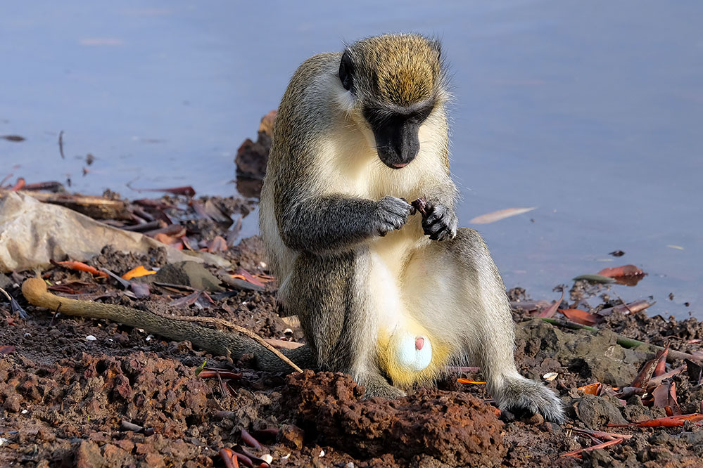 Singe vert en train de décortiquer un crabe (Toubacouta)