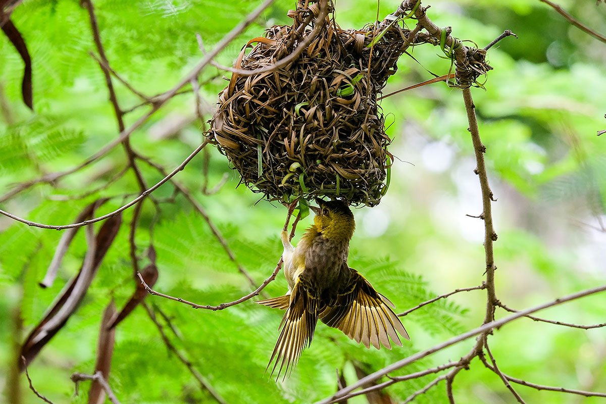 Tisserin gendarme femelle tissant son nid (Palmarin)