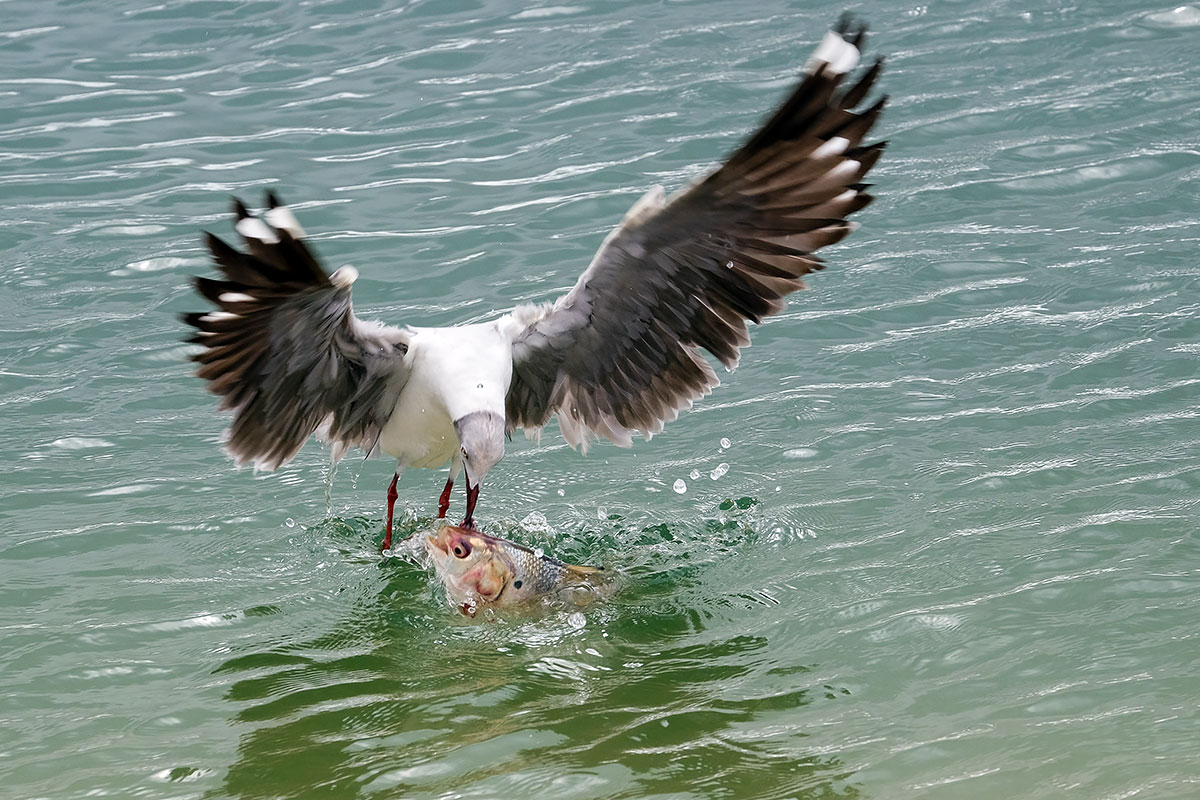 Mouette à tête grise à table (le poisson ne souffre pas, soyez rassurés : la mouette est un charognard, le poisson est mort depuis longtemps !) (Palmarin, Djiffer)