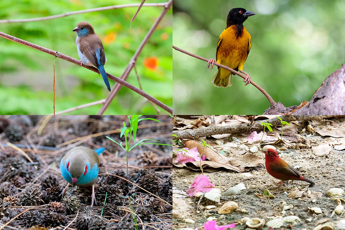 À gauche : cordon bleu à joues rouges. À droite : en bas : amarante du Sénégal ; en haut : tisserin gendarme mâle (Palmarin)