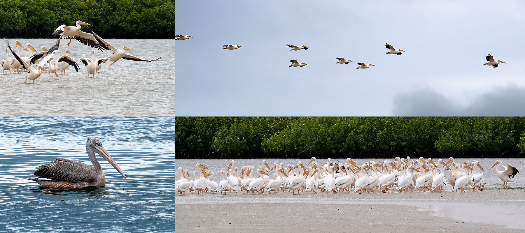 Pélicans (lagune de Somone, sauf le pélican gris : Palmarin, Djiffer)
