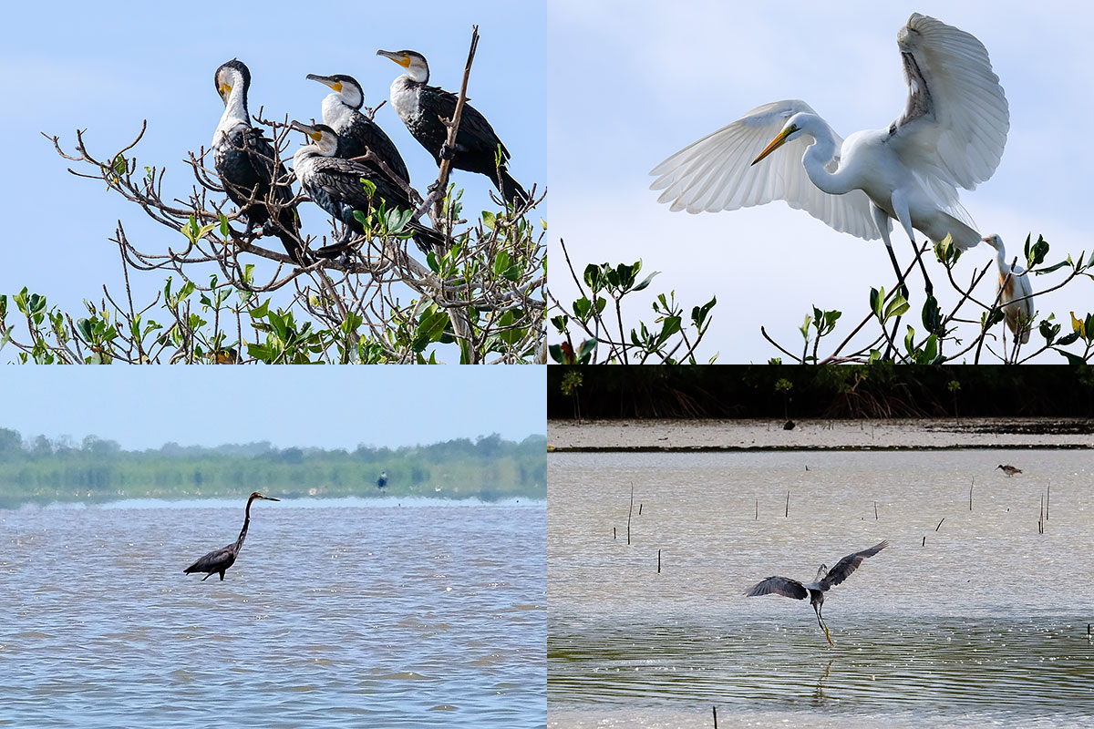 Dans le sens horaire : quatre cormorans, aigrette, héron cendré, héron Goliath (lagune de Somone)