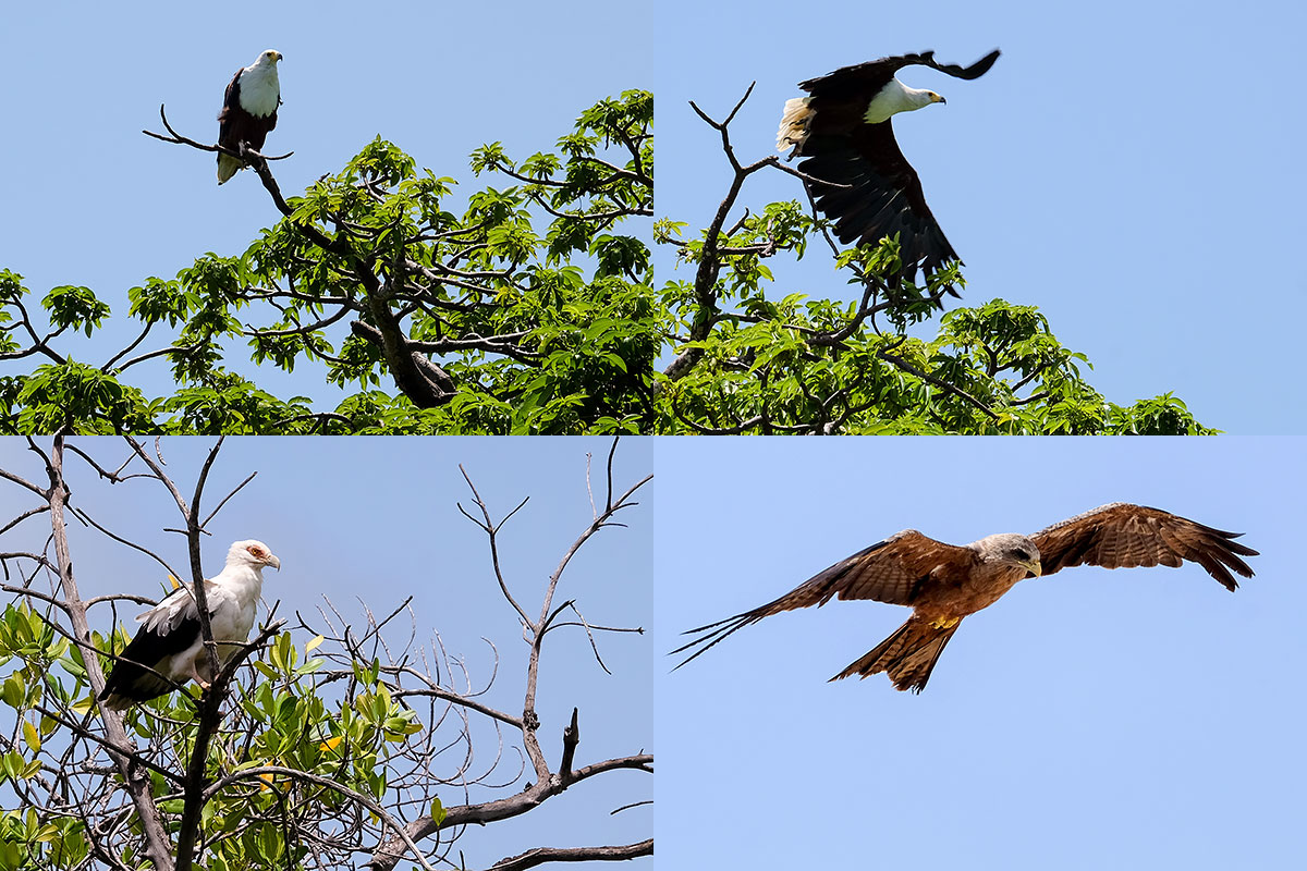 En haut : pygargue vocifère, ou aigle pêcheur (Toubacouta). En bas à gauche : vautour palmiste, ou palmiste africain (Toubacouta). En bas à droite : milan brun (Gorée)