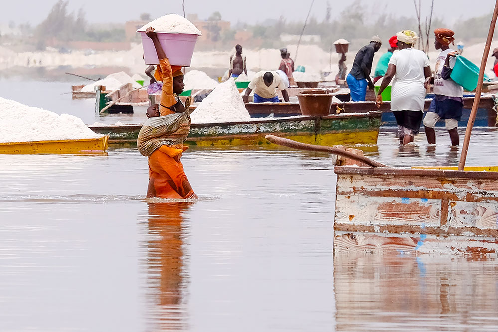 Lac rose, plus rose que la vie de ces porteuses de sel (exclusivement des femmes..., guinéennes pour la plupart), qui travaillent dans une eau à la salinité corrosive